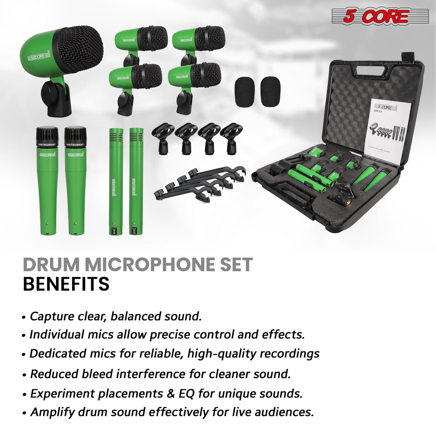 【Professional 9 Piece Drum Mic Kit For Full Set Recording】Capture every beat with this 9 piece drum microphone set that includes mics for bass, snare, toms, overheads, and instruments. Ideal for both live performance and studio recording, this complete drum mic kit delivers balanced sound and crystal-clear audio reproduction for your drum set 9 piece setup.