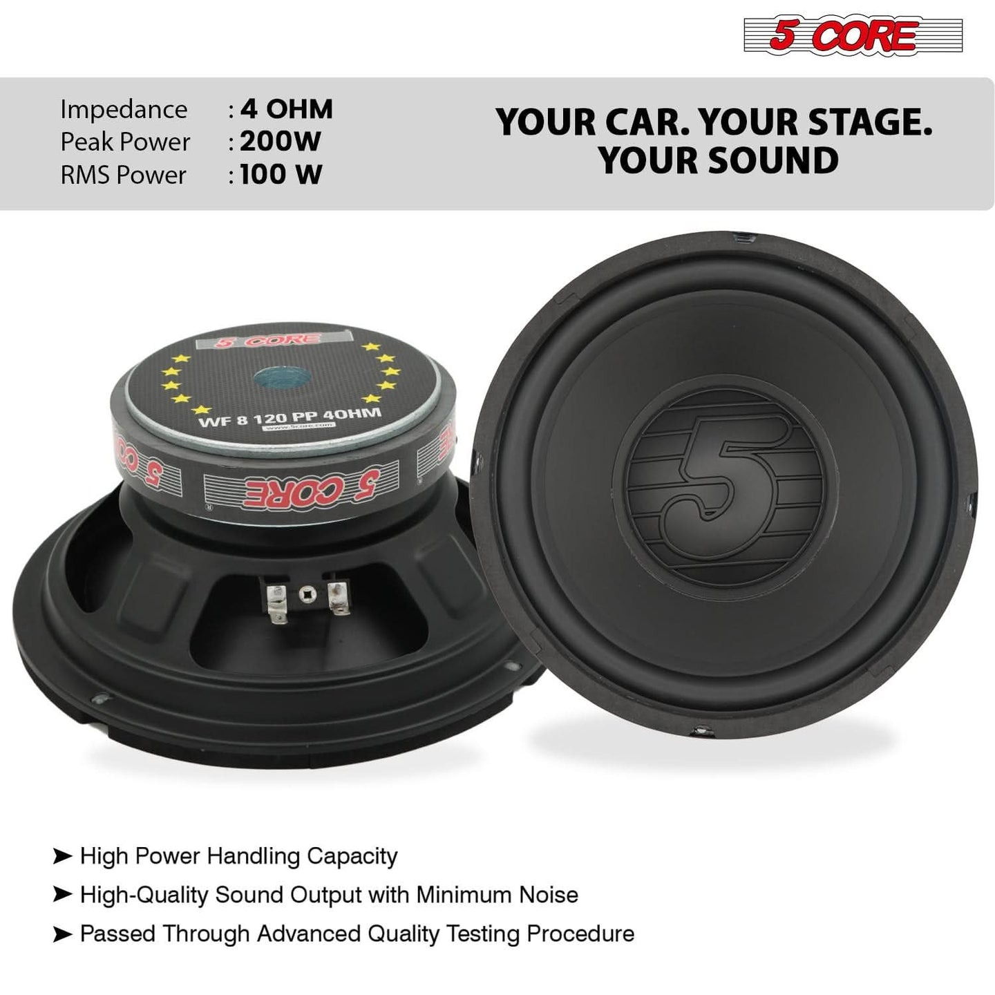 【High Power 8 Inch Woofer 】Delivers 100W RMS / 200W Peak for deep, punchy bass. Perfect upgrade for car speakers or custom car subwoofers setup.