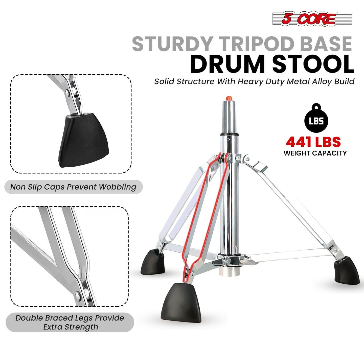 Upgrade your drumming experience with the 5 Core Air-Adjustable Velvet Saddle Drum Throne. Featuring a 4-inch high-density foam cushion with a soft velvet cover, this ergonomic saddle seat ensures maximum comfort for long practice or performance sessions. The air-lift height adjustment (19"–25") allows precise, effortless customization, while the double-braced steel legs and non-slip rubber feet provide rock-solid stability, supporting up to 441 lbs. Ideal for drummers, guitarists, and keyboardists, its sleek design and premium finish add style to any setup. Lightweight, durable, and versatile, this drum throne delivers unmatched comfort, stability, and professional appeal for musicians of all levels. |