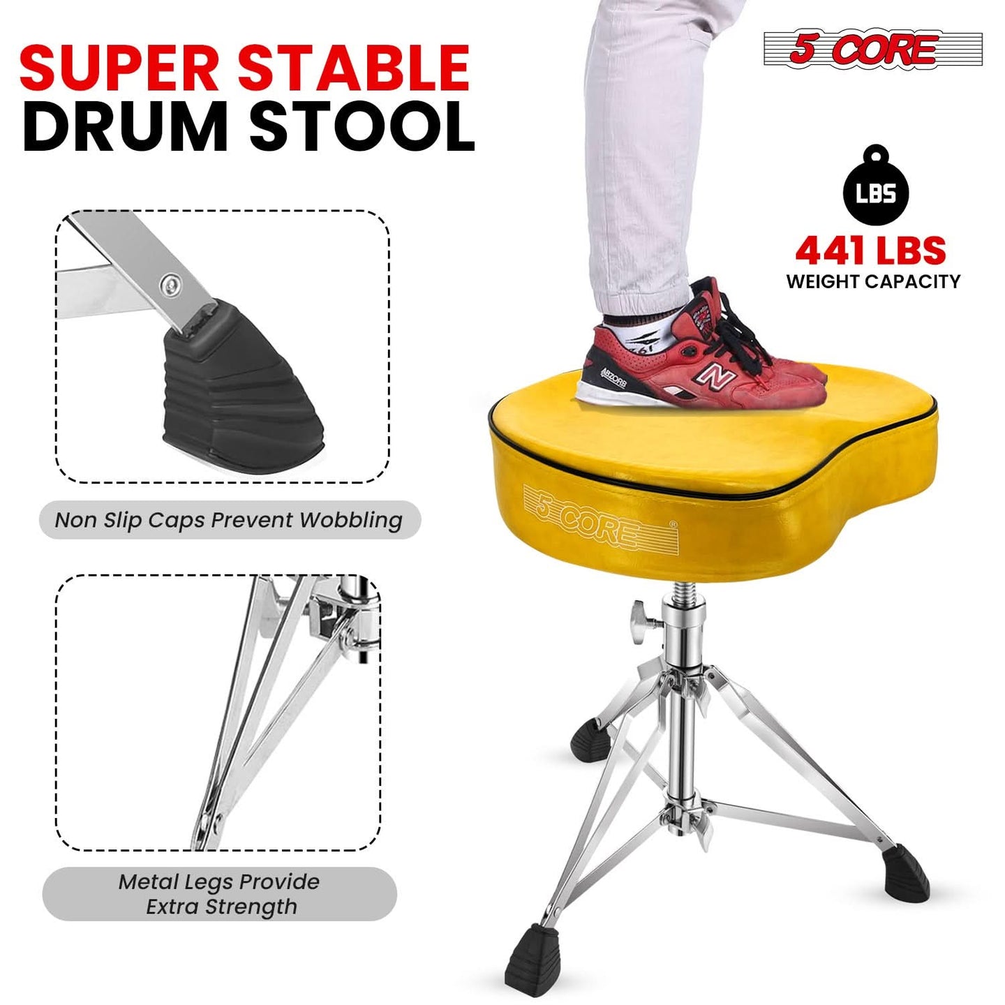 【Thick Padded Drum Throne】 Upgraded from 2.5" to a 4" high-density sponge for enhanced comfort and support, featuring an ergonomic 17-inch wide saddle-style seat. Perfect for extended drumming sessions.