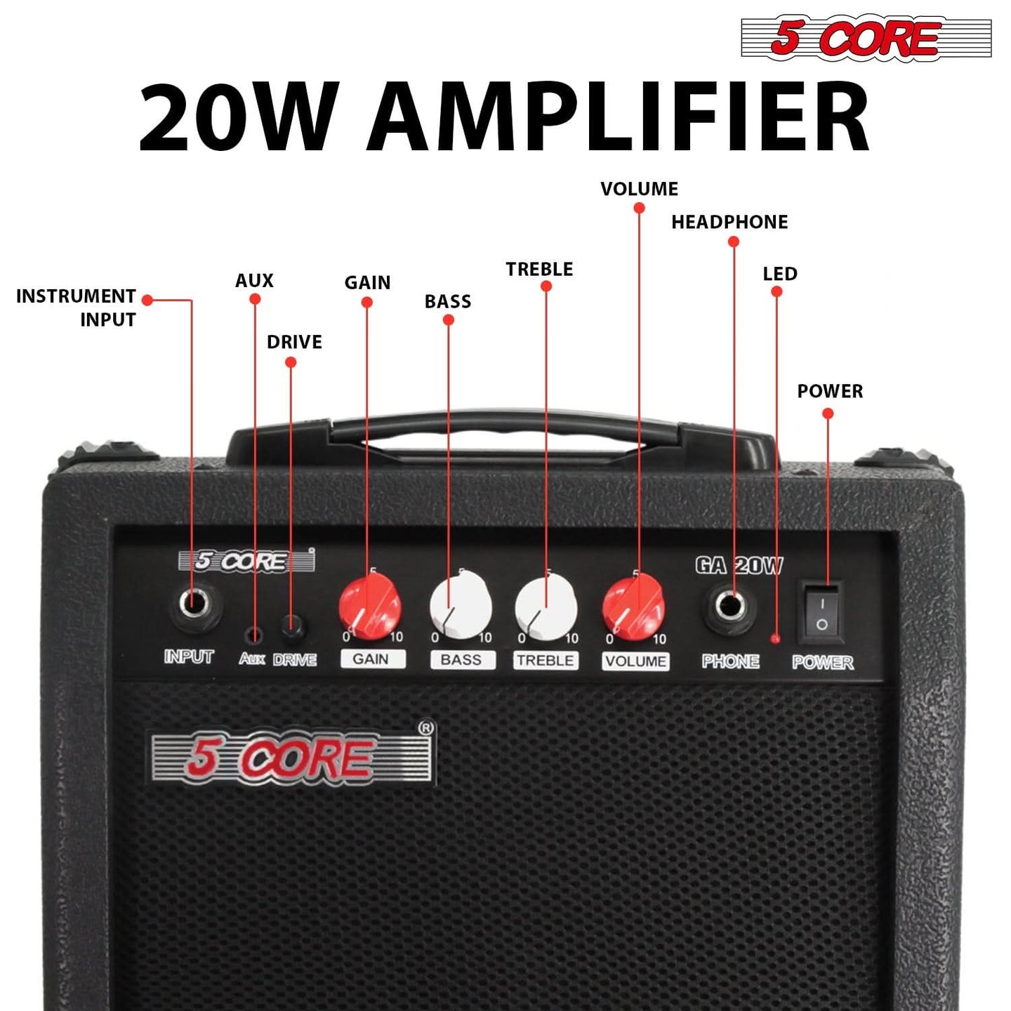Unlock your true sound with this 20 watt electric guitar amplifier, perfect for beginners and pros alike. Whether you're practicing at home or jamming on the go, this portable guitar amp delivers clear, powerful tone through its 6.5" speaker. Easily shape your sound with gain, bass, treble, and volume controls, plus enjoy silent practice with the guitar headphone amp jack and AUX input. Built tough with rubber-protected corners, it’s a reliable mini guitar amp for daily use. Ideal as a practice amplifier for electric guitar, bass amp, or acoustic guitar amplifier—this compact amp fits every playing style. |