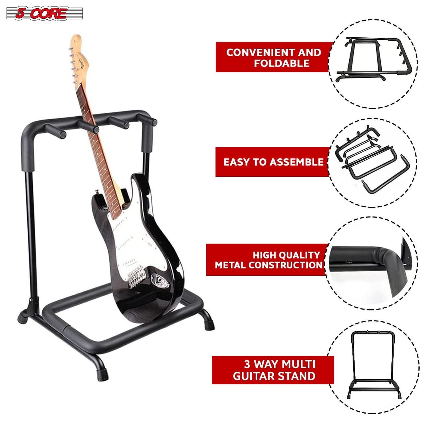 Organize your guitar collection with this professional 3 guitar stand floor, designed to securely hold up to three guitars. Made from durable metal alloy with a sleek black finish, this stand features extended soft padding to protect your instruments. Its foldable design ensures easy storage and transport, making it perfect for home, studio, and stage use. Compatible with the most popular brands and guitar types, including Firefly, Warlock, Ivy, acoustic, and electric bass guitars, this guitar stand is an ideal accessory for any musician with multiple guitars. Whether you need a triple guitar rack or a foldable guitar stand, this multi guitar rack offers the perfect solution for keeping your guitars accessible and safe. |