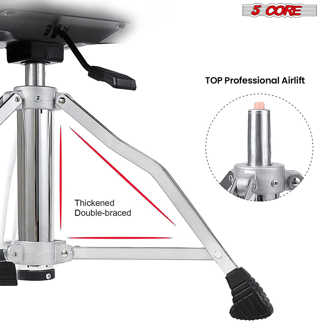 Engineered for superior strength and balance, the drum chair features a reinforced double-braced tripod base that supports up to 441 lbs — ensuring reliability for every drummer. |