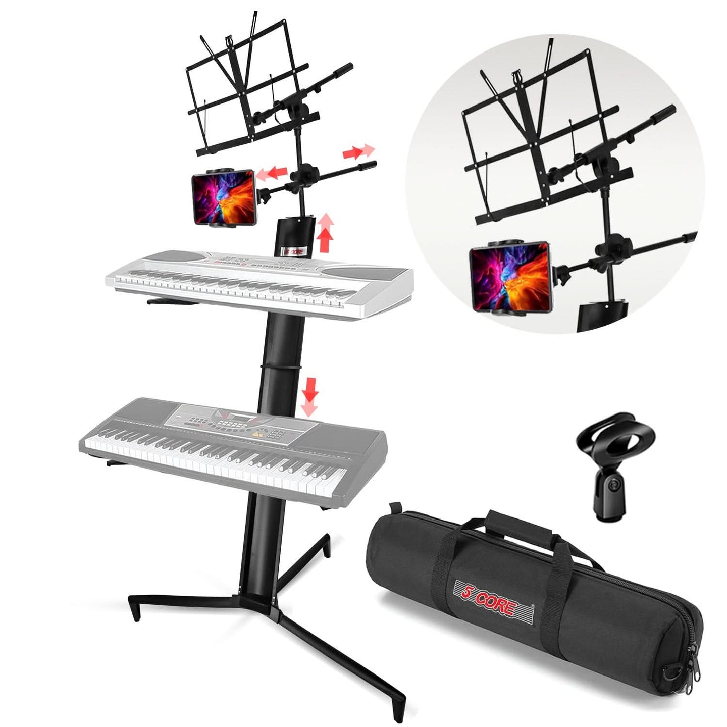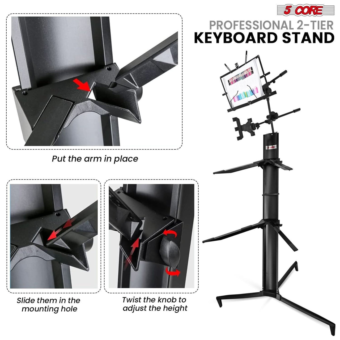 【Adjustable Dual-Tier Arms】Customize the height for comfortable playing, whether standing or sitting. The lower tier holds a standard keyboard, while the upper tier supports keyboards, DJ gear, or a laptop.