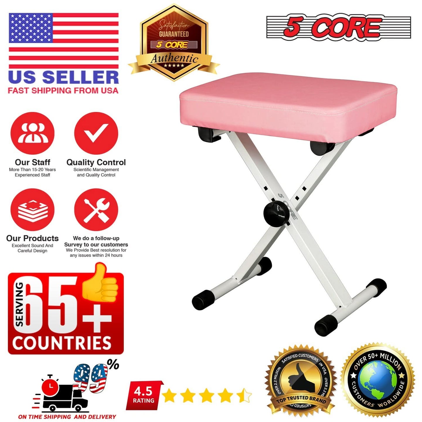 | Our padded stool is designed with care. It features powder-coated paint; it resists UV rays and corrosion. | The thick padded seat is spill-proof and very easy to maintain. If it gets dusty, just use a wet cloth to clean it. | The adjustable piano bench lets you easily change its height with four different positions to 14.5”/17.5”/19.5”/20.5”, making it simple to find the perfect setting. | The X-frame metal square tube size is 40*20mm. It is sturdy and can withstand the rigors of regular use and rough handling. |