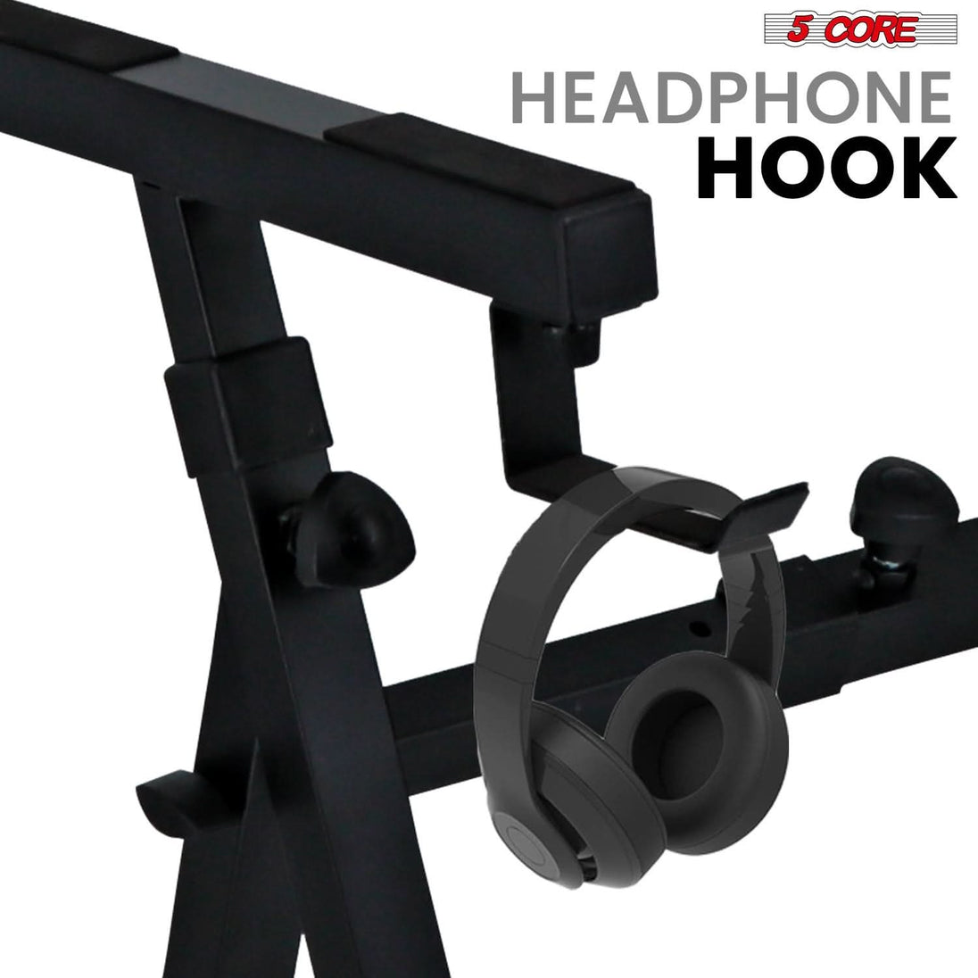 | Super fast and easy assembly with clear instructions for quicker setup in a few minutes. No special tools are required. | Securely support your keyboard, digital piano, and synthesizer, ensuring the stand remains steady and stable. The robust Z-frame design prevents wobbling or tipping. | Our keyboard display stand, equipped with rubberized, non-slip feet and hands, secure strap ensures the instrument stays firmly in place, preventing any unwanted movement. | The keyboard stand features a convenient headphone holder, which stores and keeps your over-the-ear headset out of your way so you can focus on playing. |