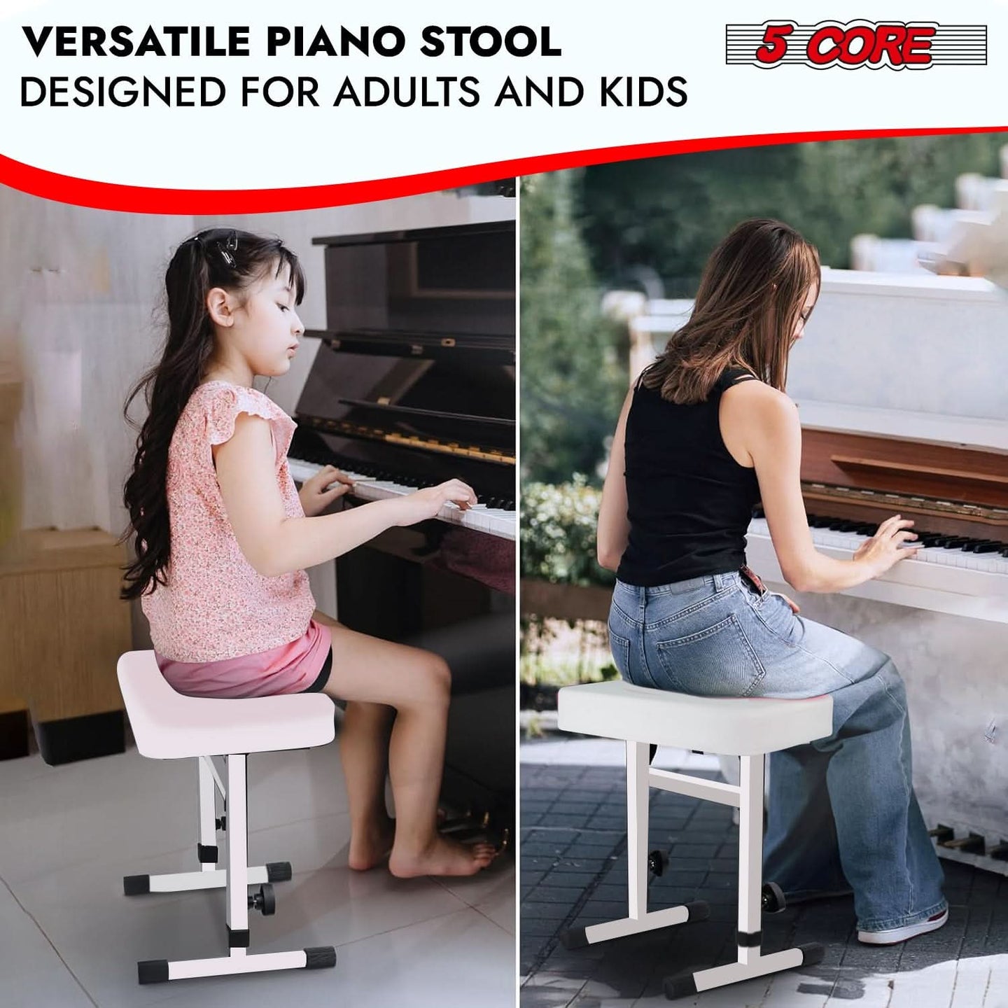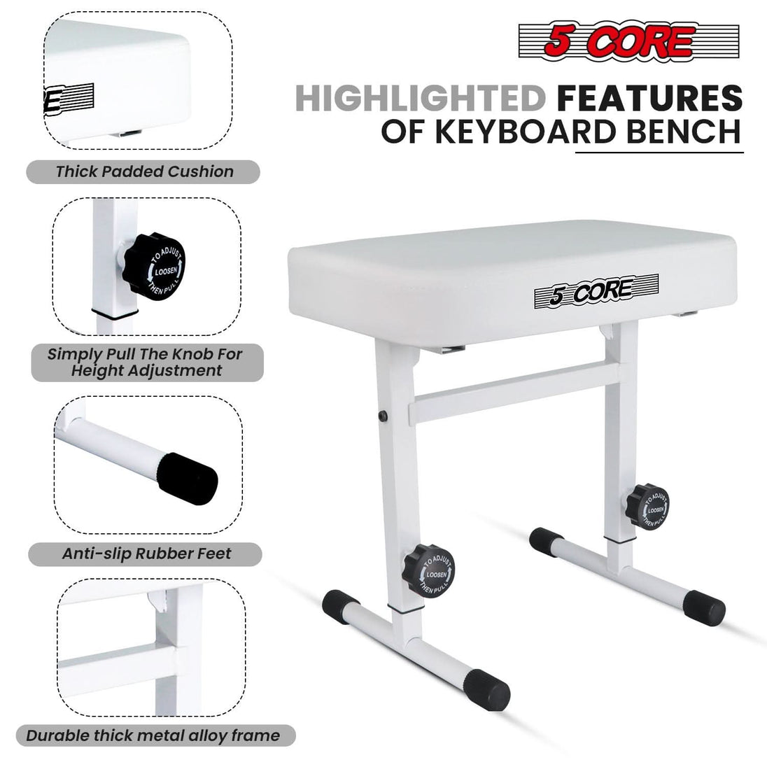 | 5 Core professional keyboard bench offers exceptional support with a 260 lb weight capacity, perfect for adults and kids. The padded 3 inch thick breathable sponge seat ensures comfort during long playing sessions, while the adjustable height (17 inches to 22 inches) and 5 position gear system allow for easy customization.